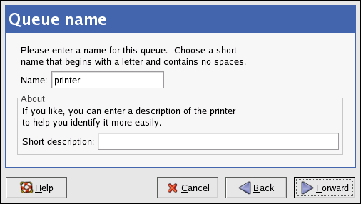 In the window shown in Figure 27-3, enter a unique name for the printer in the Name text field. The printer name cannot contain spaces and must begin with a letter. The printer name may contain letters, numbers, dashes (-), and underscores (_). Optionally, enter a short description for the printer, which can contain spaces.