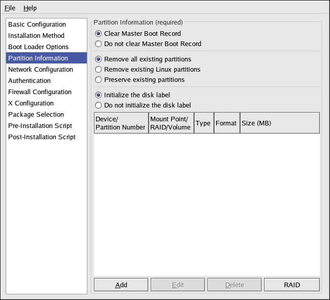 Select whether or not to clear the Master Boot Record (MBR). You can also choose to remove all existing partitions, remove all existing Linux partitions, or preserve existing partitions.