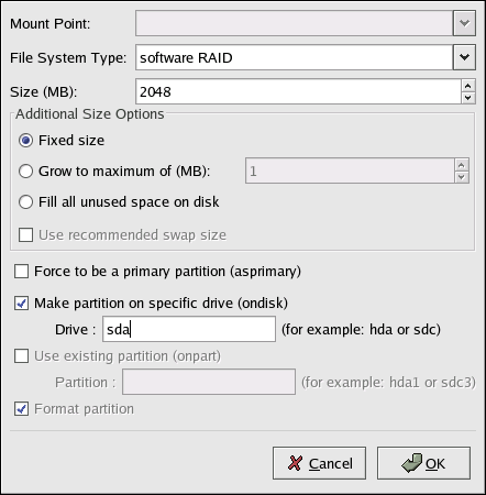 Configure the partitions as previously described, except select Software RAID as the file system type. Also, you must specify a hard drive on which to make the partition or specify an existing partition to use.