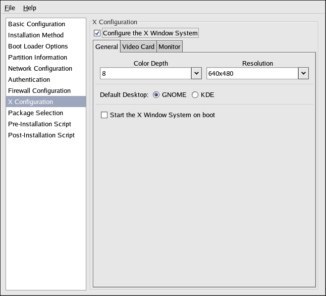 The first step in configuring X is to choose the default color depth and resolution. Select them from their respective pulldown menus. Be sure to specify a color depth and resolution that is compatible with the video card and monitor for the system.