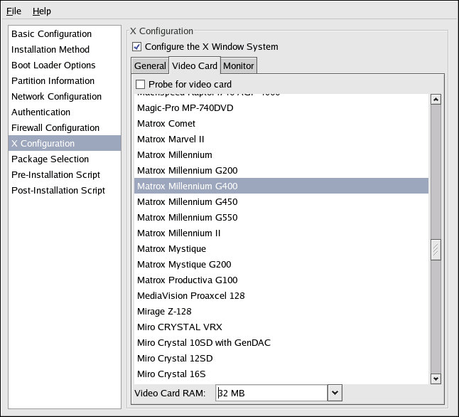 Alternatively, you can select the video card from the list on the Video Card tab as shown in Figure 8-12. Specify the amount of video RAM the selected video card has from the Video Card RAM pulldown menu. These values are used by the installation program to configure the X Window System.