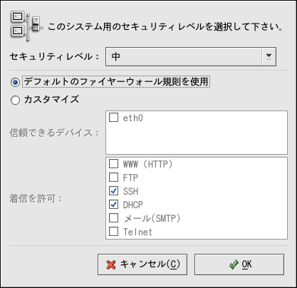 選択されたオプションは/etc/sysconfig/redhat-config-securitylevelファイルにも 書き込まれるため、次回アプリケーションが起動される時にその設定を復元できます。このファイルは手動で 編集しないで下さい。