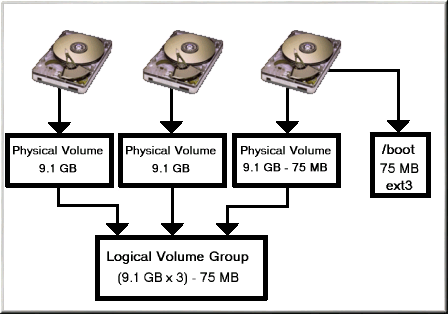 論理ボリュームグループは、 /home や /のような マウントポイントに割り当てられる論理ボリュームと、 ext3のような ファイルシステムに分けられます。「パーティション」が全容量まで満杯になると、パーティションの容量を 増やす為に、論理ボリュームグループの空き領域を論理ボリュームに追加することができます。新しいハード ドライブがシステムに追加される時、それは論理ボリュームグループに追加できます。そしてパーティション として存在する論理ボリュームは拡張することが出来ます。