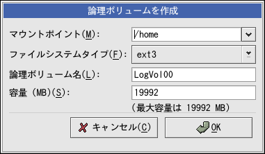 /homeなどのマウントポイントで論理ボリュームを 作成します。/bootは論理ボリュームになれない事を 忘れないで下さい。論理ボリュームを追加するには、論理ボリューム セクションの追加ボタンをクリックします。すると 図11-3に示されているようなダイアログウィンドウが 表示されます。