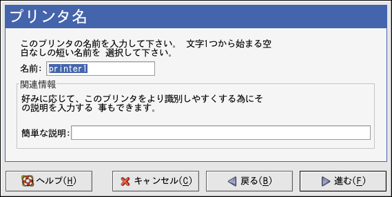 図27-3の画面で示してあるように、プリンタ名の テキストフィールドにプリンタ用の独特の名前を入力します。プリンタ名は空白を含むことができず、 文字で始まる必要があります。 プリンタ名は文字、数字、ハイフン(-)、下線(_)を含むことが出来ます。 オプションとして、空白を含むことができるプリンタ用の短い説明を入力します。