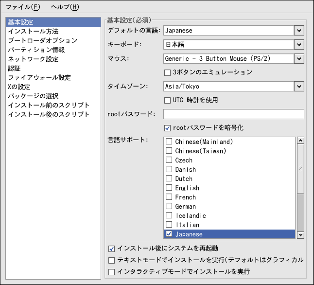 キックスタート設定を使うと、グラフィカルな ユーザーインターフェイスを通してキックスタートファイルを 作ることができ、ファイルの正しい構文を覚えておく必要が ありません。