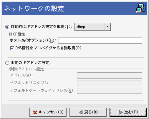 図12-2で 示しているように、ネットワークの設定の ウィンドウで、DHCPか静的IPアドレスのどちらかを選択 します。ネットワークを接続するたびにデバイスにさまざまなIP アドレスが割り当てられる場合は、ホスト名を指定しないで ください。進むをクリックして続けます。