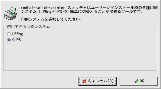 印刷システムを切替えるには、プリンタシステム切替アプリケーションを 実行します。開始するには、パネル上のメインメニューボタン=> システム設定 =>More System Settings => プリンタシステム切替と選択していきます。又は、シェルプロンプト (例えば、 XTerm や GNOMEターミナル)でコマンドredhat-switch-printerを 入力します。