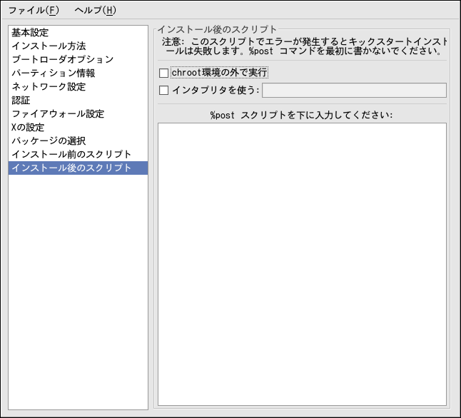 インストールス後のクリプトをchroot環境外で実行するには、 インストール後のスクリプトウィンドウの 先頭に表示されるこのオプションのチェックボタンをクリック します。これは、%postセクションで --nochrootオプションを使用するのと 同じです。