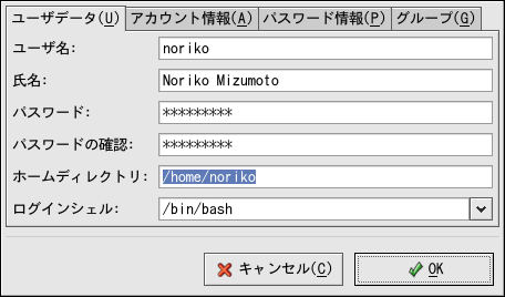 ユーザーデータ—ユーザーを追加したときに設定される基本的なユーザー情報を表示します。このタブを使用して、ユーザーのフルネーム、パスワード、ホームディレクトリ、ログインシェルなどを変更します。