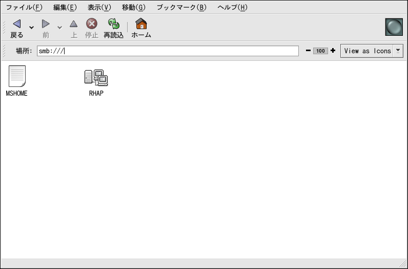 Nautilusを使用して、ネットワーク上の使用可能なSamba共有を表示することもできます。 パネル上のメインメニューボタン =>ネットワークサーバと進んで、 ネットワークのSambaのワークグループの一覧を表示します。また、Nautilusの場所:のバーに smb:と入力してワークグループを表示することも出来ます。