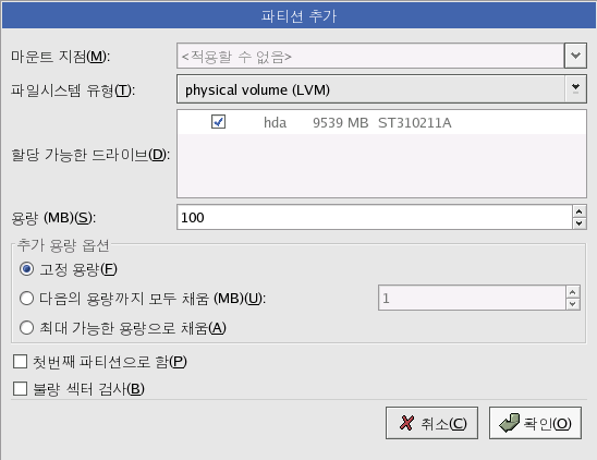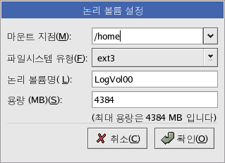 /home¿Í °°Àº ¸¶¿îÆ® ÁöÁ¡À» Áö´Ñ ³í¸® º¼·ýÀ» »ý¼ºÇϽʽÿÀ. /boot´Â ³í¸® º¼·ýÀÌ µÉ ¼ö ¾ø´Ù´Â »ç½ÇÀ» ±â¾ïÇØ Áֽñ⠹ٶø´Ï´Ù. ³í¸® º¼·ýÀ» Ãß°¡ÇϽ÷Á¸é ³í¸® º¼·ý ¼½¼Ç¿¡¼ Ãß°¡ ¹öưÀ» Ŭ¸¯ÇØ ÁֽʽÿÀ. ±×¸² 11-3¿¡¼ º¸ÀÌ´Â °Í°ú °°Àº ´ëÈ »óÀÚ°¡ ³ªÅ¸³¯ °ÍÀÔ´Ï´Ù.