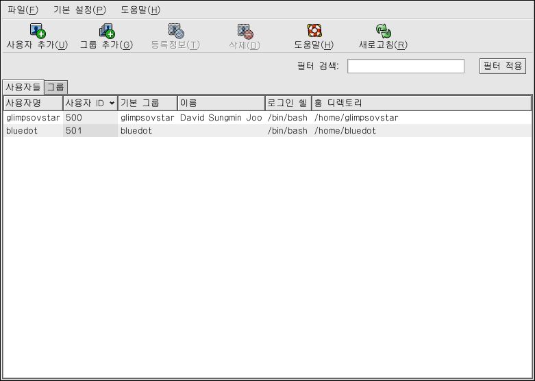 »ç¿ëÀÚ °ü¸® µµ±¸¸¦ »ç¿ëÇϽ÷Á¸é, X À©µµ¿ì ½Ã½ºÅÛÀÌ ½ÇÇà ÁßÀÌ¸ç ·çÆ® ±ÇÇÑÀÌ ÀÖ¾î¾ß Çϰí, ¶ÇÇÑ redhat-config-users RPM ÆÐŰÁö°¡ ¼³Ä¡µÇ¾î ÀÖ¾î¾ß ÇÕ´Ï´Ù. µ¥½ºÅ©Å¾¿¡¼ »ç¿ëÀÚ °ü¸® µµ±¸¸¦ ½ÇÇàÇϽ÷Á¸é ÆÐ³Î¿¡¼ ÁÖ ¸Þ´º ¹öư => ½Ã½ºÅÛ ¼³Á¤ => »ç¿ëÀÚ¿Í ±×·ìÀ» ¼±ÅÃÇϽʽÿÀ. ¶Ç´Â XTermÀ̳ª GNOME Å͹̳ΰú °°Àº ½© ÇÁ·ÒÇÁÆ® »ó¿¡¼ redhat-config-users ¸í·ÉÀ» ÀÔ·ÂÇÏ½Ã¸é µË´Ï´Ù.