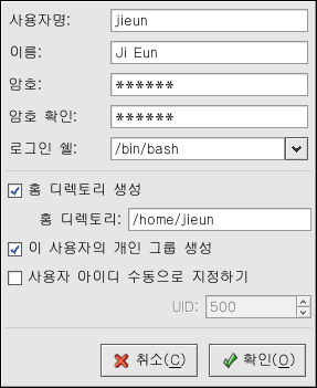 ·Î±×ÀÎ ½©À» ¼±ÅÃÇϽʽÿÀ. ¸¸ÀÏ ¾î¶² ½©À» ¼±ÅÃÇÒ Áö È®½ÅÀÌ ¼Áö ¾Ê´Â´Ù¸é, /bin/bashÀÇ ±âº» °ªÀ» ¼ö¶ôÇÕ´Ï´Ù. ±âº» Ȩ µð·ºÅ丮´Â /home/»ç¿ëÀÚ¸í (username) ÀÔ´Ï´Ù. ÇØ´ç »ç¿ëÀÚ¸¦ À§ÇØ »ý¼ºµÈ Ȩ µð·ºÅ丮¸¦ º¯°æ °¡´ÉÇÏ¸ç ¶Ç´Â È¨ µð·ºÅ丮 »ý¼ºÀ» ¼±ÅÃ ÇØÁ¦ÇÏ¿© Ȩ µð·ºÅ丮¸¦ ¸¸µéÁö ¾ÊÀ¸¼Åµµ µË´Ï´Ù.