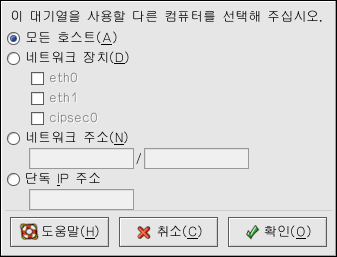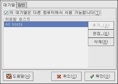 ´ë±â¿À» °øÀ¯Çϵµ·Ï ¼±ÅÃÇϽøé, ±âº» °ªÀ¸·Î ¸ðµç È£½ºÆ®°¡ °øÀ¯ ÇÁ¸°ÅÍ·Î ÀμâÇÒ ¼ö ÀÖµµ·Ï Çã¿ëµË´Ï´Ù. ±×·¯³ª ³×Æ®¿öÅ© »óÀÇ ¸ðµç ½Ã½ºÅÛ¿¡¼ ´ë±â¿·Î ÀμâÇϵµ·Ï Çã¿ëÇÏ´Â °ÍÀº À§ÇèÇÕ´Ï´Ù. ƯÈ÷ ½Ã½ºÅÛÀÌ ÀÎÅͳݿ¡ Á÷Á¢ ¿¬°áµÈ °æ¿ì¿¡´Â ´õ¿í ±×·¯ÇÕ´Ï´Ù. ¸ðµç È£½ºÆ® Ç׸ñÀ» ¼±ÅÃÇϽŠÈÄ ÆíÁý ¹öưÀ» Ŭ¸¯ÇÏ½Ã¸é ±×¸² 27-18¿¡¼ º¸¿©Áø âÀÌ ³ªÅ¸³³´Ï´Ù. ¿©±â¼ ÀÌ ¿É¼ÇÀ» º¯°æÇÏ½Ã±æ ±ÇÀåÇÕ´Ï´Ù.