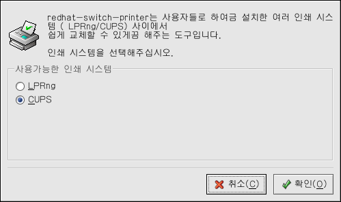 LPRng ¶Ç´Â CUPS Àμ⠽ýºÅÛÀ» ¼±ÅÃÇϽñ⠹ٶø´Ï´Ù. Red Hat Linux 9¿¡¼´Â CUPS°¡ µðÆúÆ® ÀÔ´Ï´Ù. ÇÑ °³ÀÇ Àμ⠽ýºÅÛ¸¸ ¼³Ä¡µÇ¾î ÀÖ´Ù¸é, ±× ½Ã½ºÅÛ¸¸ ¿É¼ÇÀ¸·Î ³ªÅ¸³¯ °ÍÀÔ´Ï´Ù.