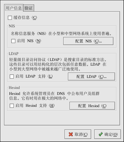 验证配置工具提供了配置 NIS、LDAP、和 Hesiod 来检索用户信息,以及把 LDAP、Kerberos、和 SMB 配置成验证协议的图形化界面。
