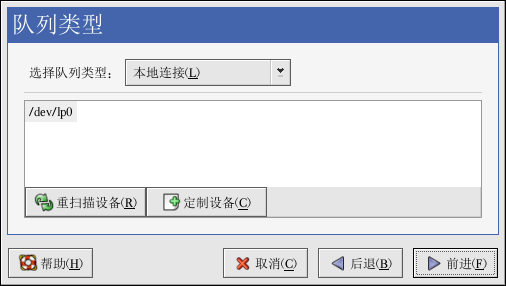 点击了「前进」后,如图 27-4所示的窗口就会出现。从「选择队列类型」中选择「本地连接」,然后选择设备。这个设备通常是 /dev/lp0(并行打印机)或 /dev/usb/lp0(USB 打印机)。如果列表中没有设备,点击「重扫描设备」来重新扫描计算机或点击「定制设备」来手工指定它。点击「前进」来继续。