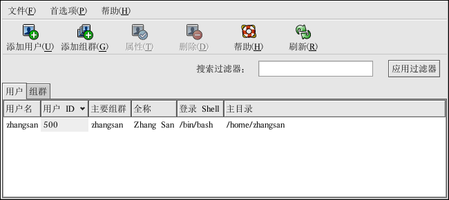 要使用 用户管理器,你必须运行 X 窗口系统,具备根特权,并且安装了redhat-config-users RPM 软件包。要从桌面启动 用户管理器,点击面板上的「主菜单」 => 「系统设置」 => 「用户和组群」,或在 shell 提示(如 XTerm 或 GNOME 终端)下键入 redhat-config-users 命令。
