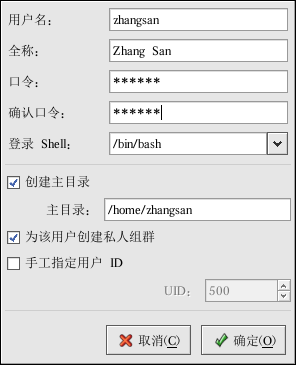 要添加新用户,点击「添加用户」按钮。一个如图 25-2 所示的窗口就会出现。在适当的字段内键入新用户的用户名和全称。在「口令」和「确认口令」字段内键入口令。口令必须至少有六个字符。