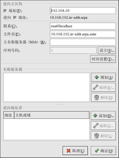 「逆向地址表」 — 在逆向主区和它们的主机名内的 IP 地址列表。譬如,对于逆向主区 192.168.10,你可以在「逆向地址表」中添加 192.168.10.1,以及主机名 one.example.com.。主机名一定要以点(.)结束来 表明它是主机的全名。