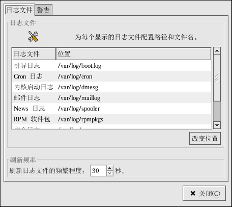 你可以在「日志文件」标签中改变程序所要查找日志文件的位置。从列表中选择日志文件,然后点击「改变位置」按钮。键入日志文件的新位置,或点击「浏览」按钮来从文件选择对话框中定位文件位置。点击「确定」来返回到首选项窗口,然后点击「关闭」来返回到主窗口。