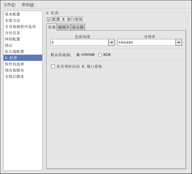 如果你要安装 X 窗口系统,你可以在 kickstart 安装过程中配置它。方法是,在如图 8-11所示的「X 配置」窗口上选择「配置 X 窗口系统」按钮。如果该选项没有被选, X 配置选项就会被禁用,skipx 选项就会被写入 kickstart 文件。