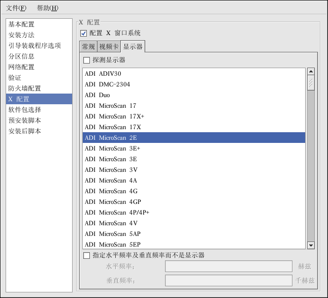 另外,你也可以从列表中选择显示器。你还可以选择「指定水平频率及垂直频率而不是显示器」选项来指定显示器的水平和垂直频率。这在你的显示器没有在列表中列出的情况下有用。注意,当这个选项被启用,显示器列表就会被禁用。