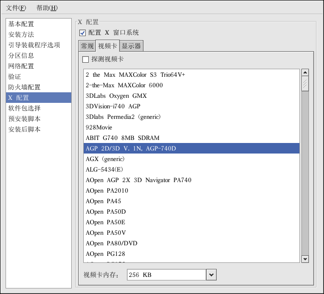「探测视频卡」被默认选择。如果你想让安装程序在安装中探测视频卡,则接受默认设置。多数现代视频卡都能被探测到。如果你选择了该选项,并且安装程序无法成功地探测视频卡,安装程序就会在视频卡配置屏幕上中止。要继续安装进程,从视频卡列表中选择一个,然后点击「下一步」。