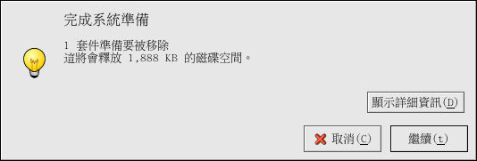 您可以結合套件的安裝與移除程序,只要選取要安裝或移除的套件群組或套件,然後再點選 更新 即可。 『完成系統準備』 的視窗將會顯示要安裝與移除的套件數。 |