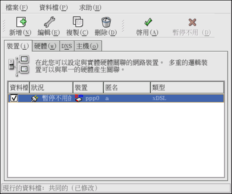 在新增完 xDSL 連線後,您可以從裝置清單中選取它,再點選 編輯 的按鈕來修改它的設定。 例如,當新增裝置後,它是預設設定在開機時不啟動。 請編輯它的組態設定以修改這個設定。
