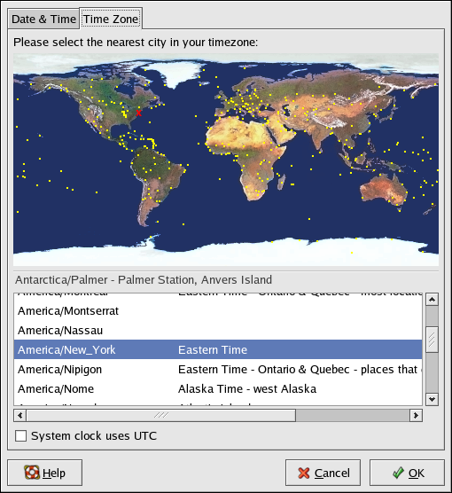To configure the system time zone, click the Time Zone tab. The time zone can be changed by either using the interactive map or by choosing the desired time zone from the list below the map. To use the map, click on the city that represents the desired time zone. A red X will appear and the time zone selection will change in the list below the map. Click OK to apply the changes and exit the program.