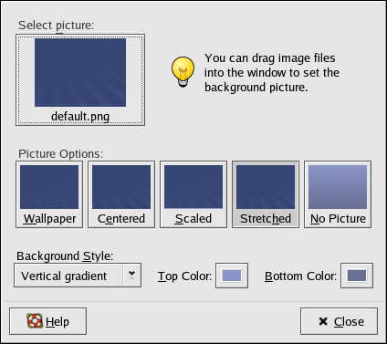 You can configure your background with new colors or a new image. To learn more about configuring your desktop background, refer to Section 2.4.1.1 Changing your Desktop Background.