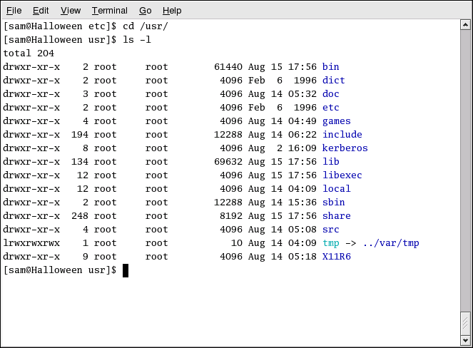 There is a lot of detail provided here. You can see who can read (r) and write to (w) the file, as well as who created the file (sam), and to which group the owner belongs (sam). Remember that, by default, the name of your group is the same as your login name.