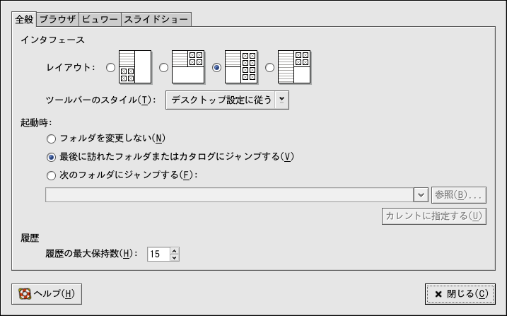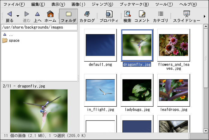 Nautilusはグラフィカル デスクトップ環境用の全般用途型ファイルマネジャ兼ブラウザ です。Nautilusは単純なイメージ 表示以外にも多くの機能を持ちますが、このセクションでは 基本的なイメージブラウザとして使用します。 Nautilusの詳細については 第2章をご覧ください。
