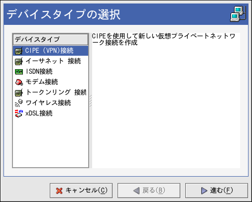 Red Hat Linuxコンピュータをワイヤレスアクセスポイント(WAP)、 または、ピアツーピア(アド-ホックとも 呼ばれる)ネットワークに、ワイヤレス(802.11x )ネットワークカードを通して接続している場合は、 ワイヤレスデバイスを設定する必要があります。 ワイヤレス接続を選択し、それから用意 されている一覧からデバイスを選択します。その後、 ポップアップのデバイス設定ウィンドウの中でそのデバイスを DHCP用か固定のIPアドレス用に設定することができます。