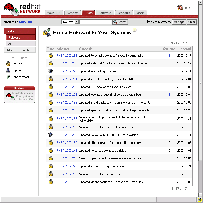 Errata 通知 — ネットワークにあるすべてのシステムに関するセキュリティに関する情報、 バグフィックスに関する情報、追加機能に関する情報を基本インターフェイスを通じて知ることが出来ます。