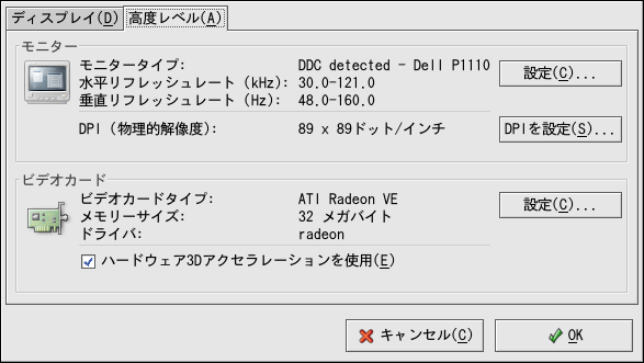 モニタを手動で設定するには、高度レベル タブをクリックします。そしてモニタータイプ エントリの横にある設定...ボタンを クリックします。ポップアップウィンドウがモニタモデルの一覧を 表示します。目的のモデルを選択しOKを クリックします。また、X 設定ツール にモニタの正しいモデルと垂直/水平同期設定を検出させる事も できます。