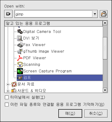The GIMP¸¦ ºñ·ÔÇÑ º¸´Ù °í±Þ À̹ÌÁö º¸±â ÇÁ·Î±×·¥À» »ç¿ëÇÏ¿© À̹ÌÁö¸¦ ¿¾î º¸½Ç ¼öµµ ÀÖ½À´Ï´Ù. À̹ÌÁö¿¡ ¿À¸¥ÂÊ Å¬¸¯ÇϽŠÈÄ ÀÌ ÆÄÀÏÀ» ¿ ÇÁ·Î±×·¥... Ç׸ñÀ» ¼±ÅÃÇϽŠÈÄ ´Ù¸¥°Í...À» ¼±ÅÃÇϽʽÿÀ. ±×·¯¸é »ç¿ëÇÒ ÀÀ¿ë ÇÁ·Î±×·¥À» ¿ ¼ö ÀÖ°Ô ÇØÁÖ´Â ÆË¾÷ ¸Þ´º°¡ ³ªÅ¸³¯ °ÍÀÔ´Ï´Ù. GIMP¸¦ ½ÇÇàÇϽ÷Á¸é, ±×¸² A-14¿¡¼ º¸¿©Áö´Â °Íó·³ ±×·¡ÇÈÀ» ¼±ÅÃÇϽŠÈÄ ÀÀ¿ë ÇÁ·Î±×·¥ ¸ñ·ÏÀ» »ìÆìº¸½Å ÈÄ GIMP ¾ÆÀÌÄÜ¿¡ Ŭ¸¯ÇϽðí È®ÀÎ ¹öưÀ» Ŭ¸¯ÇϽñ⠹ٶø´Ï´Ù.