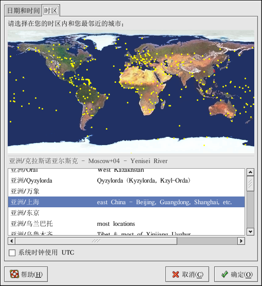 要配置系统时区,点击「时区」标签。时区可以通过互动地图来改变,也可以从地图下面的列表中选择想要的时区。要使用地图,点击代表你想要时区的城市,一个红色的「X」会出现,地图下面的列表中的时区选择也会相应改变。点击「确定」来应用改变并退出程序。