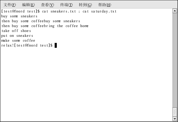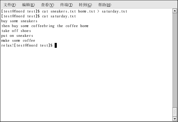下一步,使用 cat 把 home.txt 和 sneakers.txt 连接起来,然后再把两个文件的输出重导向到一个叫做 saturday.txt 的新文件(你会在图 13-7 中发现一个示例)。键入下面的命令: