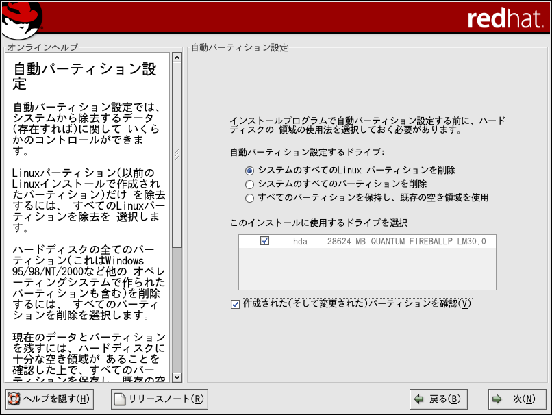 ¤³¤Î¥ª¥×¥·¥ç¥ó¤òÁªÂò¤·¤¿¾ì¹ç¡¢ÁªÂò¤·¤¿¥Ï¡¼¥É¥É¥é¥¤¥Ö¾å¤Î ¤¹¤Ù¤Æ¤Î¥Ç¡¼¥¿¤¬¥¤¥ó¥¹¥È¡¼¥ë¥×¥í¥°¥é¥à¤Ë¤è¤Ã¤Æºï½ü¤µ¤ì¤Þ¤¹¡£Red Hat Linux¤ò¥¤¥ó¥¹¥È¡¼¥ë ¤·¤Æ¤¤¤ë¥Ï¡¼¥É¥É¥é¥¤¥Ö¾å¤ËÊݸ¤·¤Æ¤ª¤¤¿¤¤¾ðÊ󤬤¢¤ë¾ì¹ç¤Ï¡¢ ¤³¤Î¥ª¥×¥·¥ç¥ó¤òÁªÂò¤·¤Ê¤¤¤Ç¤¯¤À¤µ¤¤¡£ |