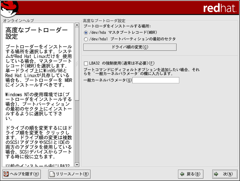 ¥·¥¹¥Æ¥à¤Ë Red Hat Linux¤·¤«¤Ê¤¤¾ì¹ç¤Ï¡¢MBR¤òÁªÂò¤·¤Þ¤¹¡£ Windows 95/98¤¬Â¸ºß¤¹¤ë¥·¥¹¥Æ¥à¤Ç¤â¡¢µ¯Æ°»þ¤ËξÊý¤ÎOS¤¬ µ¯Æ°¤Ç¤¤ë¤è¤¦¤Ë¡¢ ¥Ö¡¼¥È¥í¡¼¥À¡¼¤Ï MBR¤Ë¥¤¥ó¥¹¥È¡¼¥ë¤¹¤ëɬÍפ¬ ¤¢¤ê¤Þ¤¹¡£