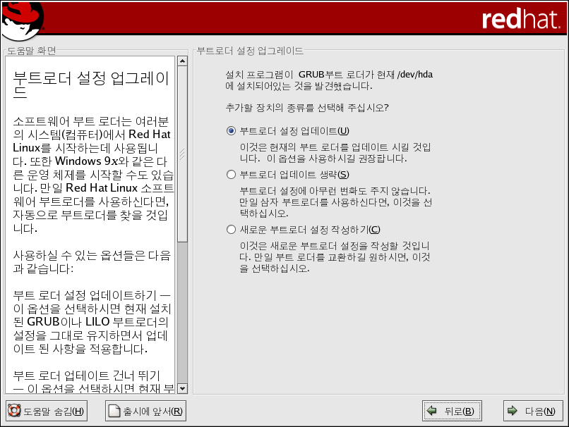 ºÎÆ®·Î´õ ¼³Á¤ ¾÷µ¥ÀÌÆ® — ÇöÀç ºÎÆ®·Î´õ (GRUB ¶Ç´Â LILO) ¼³Á¤À» º¸Á¸ÇÏ¸é¼ ¾÷µ¥ÀÌÆ®ÇÏ½Ã±æ ¿øÇϽøé ÀÌ ¿É¼ÇÀ» ¼±ÅÃÇØ ÁֽʽÿÀ.