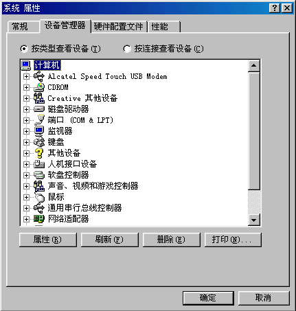 点击「设备管理器」 标签。你就会看到你的电脑的硬件配置的图形化表示。 请确定被选的是「按类型查看设备」 单选按钮。