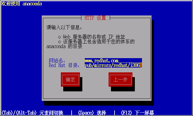 输入你要从中安装的 HTTP 站点的名称或 IP 地址,以及包含用于你的体系的 RedHat 安装文件的目录。譬如,如果 HTTP 站点包含目录/mirrors/redhat/i386/RedHat,请输入 /mirrors/redhat/i386。 如果一切都被正确地指定了,一个通知你“base/hdlist 已被检索到”的消息箱就会出现。