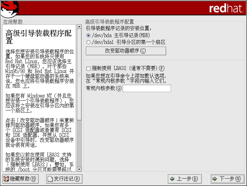 「强制使用 LBA32 (通常不需要)」选项允许你的 /boot 分区超过 1024 柱面限制。 如果你的系统支持使用 LBA32 扩展来引导超过 1024 柱面限制的操作系统, 并且你想把 /boot 分区放置在 1024 柱面之外,你应该选择该选项。
