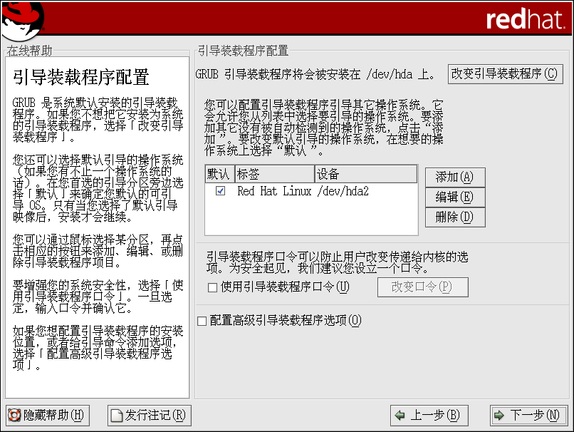每个可引导分区都被列出,包括被其它操作系统使用的分区。包含你的系统根文件系统的分区将有一个Red Hat Linux(GRUB)或 linux(LILO)「标签」。其它分区也可以有引导标签。如果你想添加或改变其它被安装程序检测到的分区的标签,单击该分区来选择它,选定后,你可以点击 「编辑」 按钮来改变引导标签。