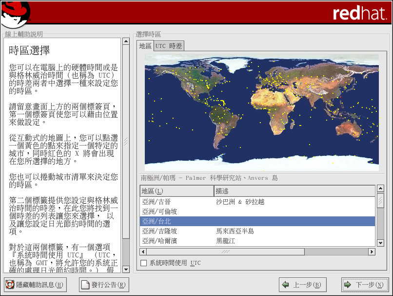 在安裝完成後,您可以使用 時間與日期設定工具 來更改您的時區設定。 請在 shell 提示符號下輸入 redhat-config-date 指令來啟動 時間與日期設定工具。 假如您不是 root,系統將會要您輸入 root 的密碼以繼續。 如要以文字模式執行 時間與日期設定工具 應用程式,請使用 timeconfig 指令。 |