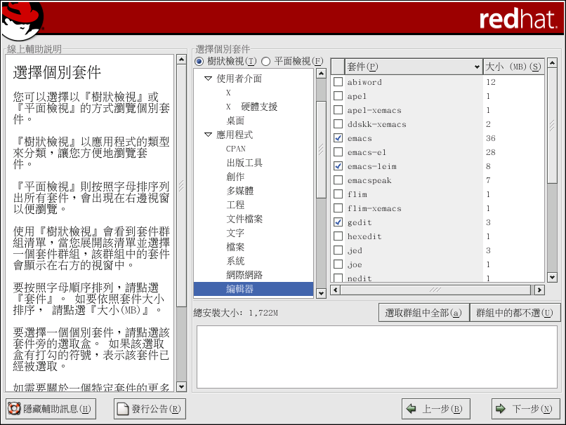 有些套件(例如,核心與某些函式庫)是需要用於每一個 Red Hat Linux 系統的,所以無法選取或取消選取它們。 這些基本套件是預設被選取的。